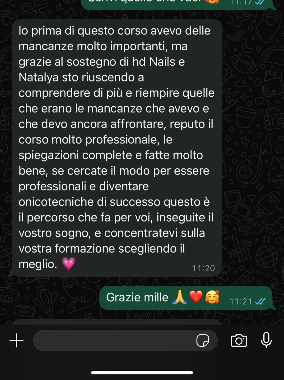 Il Percorso che ti offriamo ti garantisce di imparare tutto sul mondo delle Nails, non solo le basi. Verrai seguita dalla migliore istruttrice del territorio che sarà sempre pronta a darti supporto. Se avrai ancora dubbi potrai rivolgerti al gruppo Facebook privato. Insomma, c’è una community pronta ad accoglierti e a guidarti verso la carriera che hai sempre sognato.